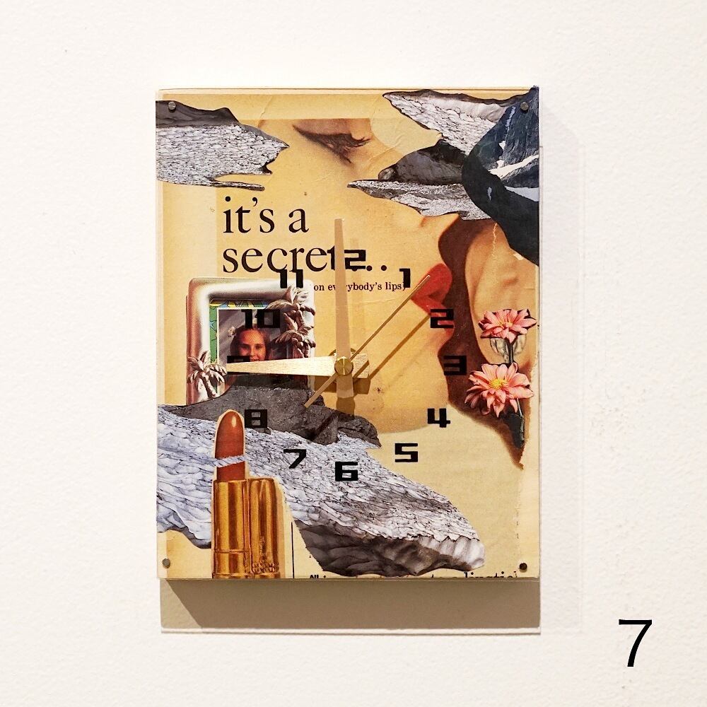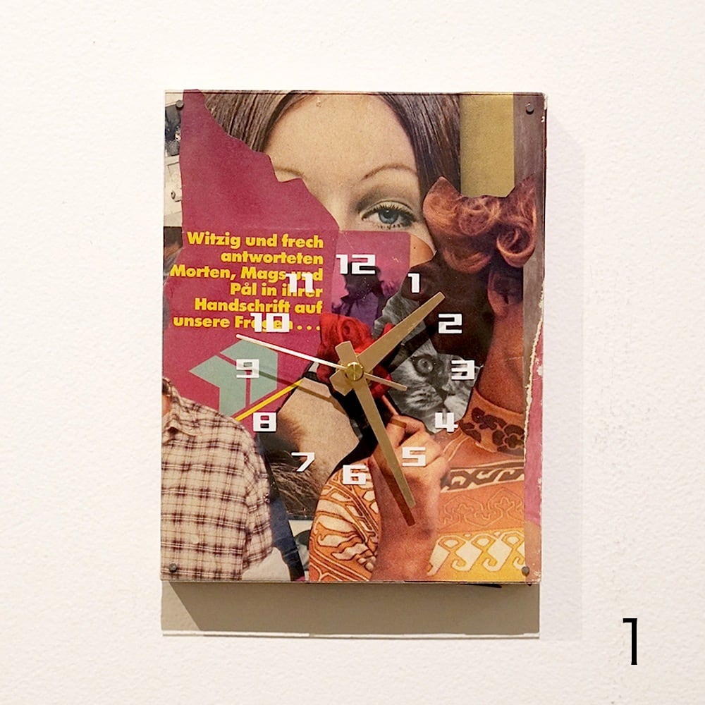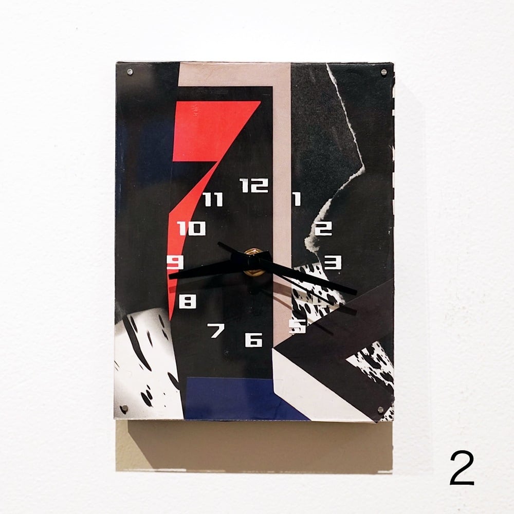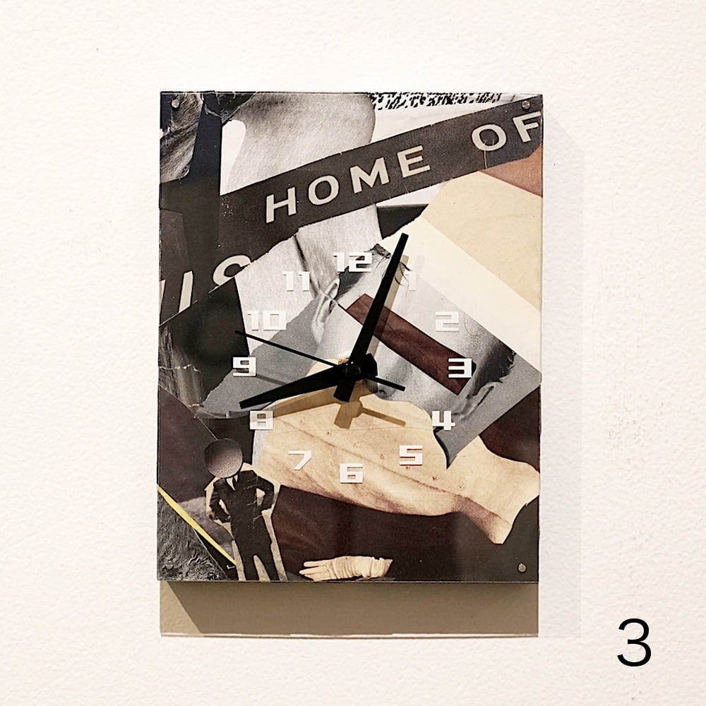 アクリル板にMANUALが時計の文字盤をシルクスクリーンして、キャンバスにonnacodomoがコラージュした上に取り付けた時計です。