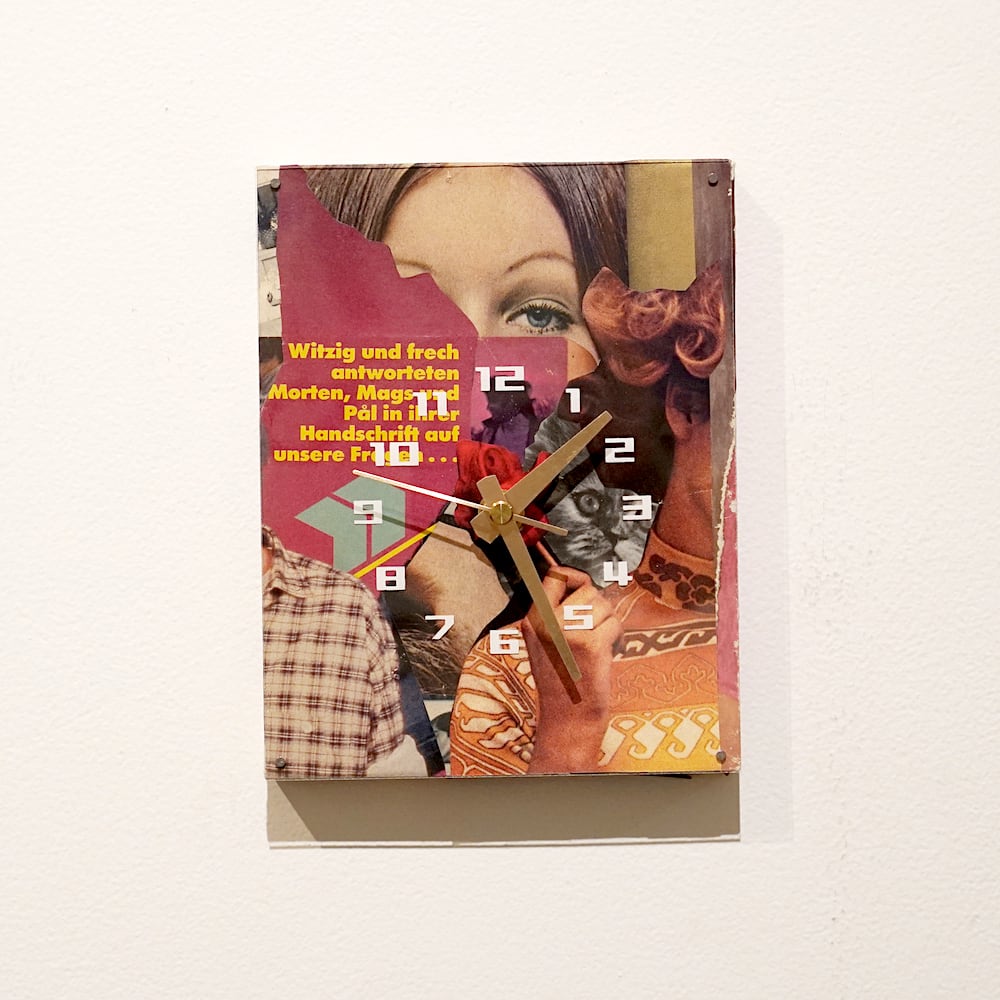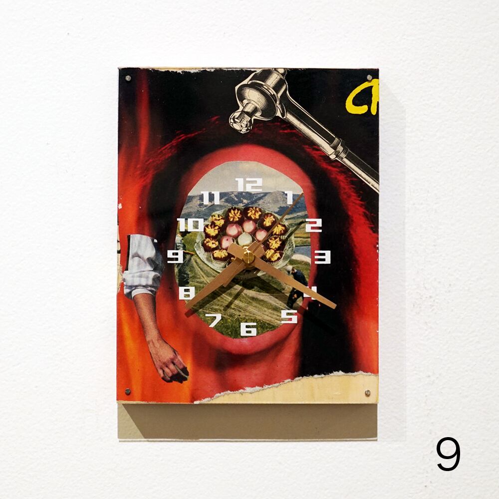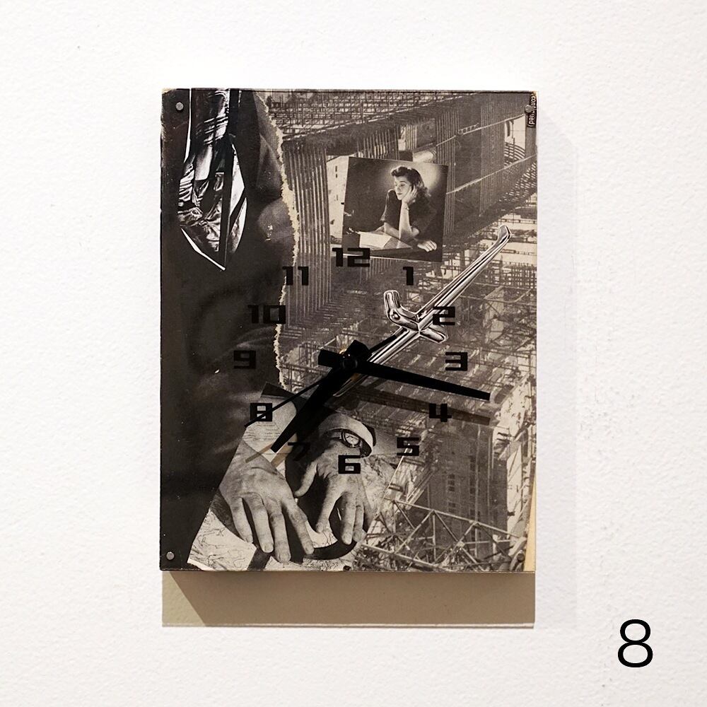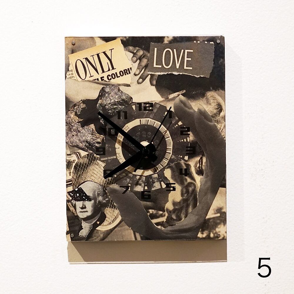 アクリル板にMANUALが時計の文字盤をシルクスクリーンして、キャンバスにonnacodomoがコラージュした上に取り付けた時計です。
