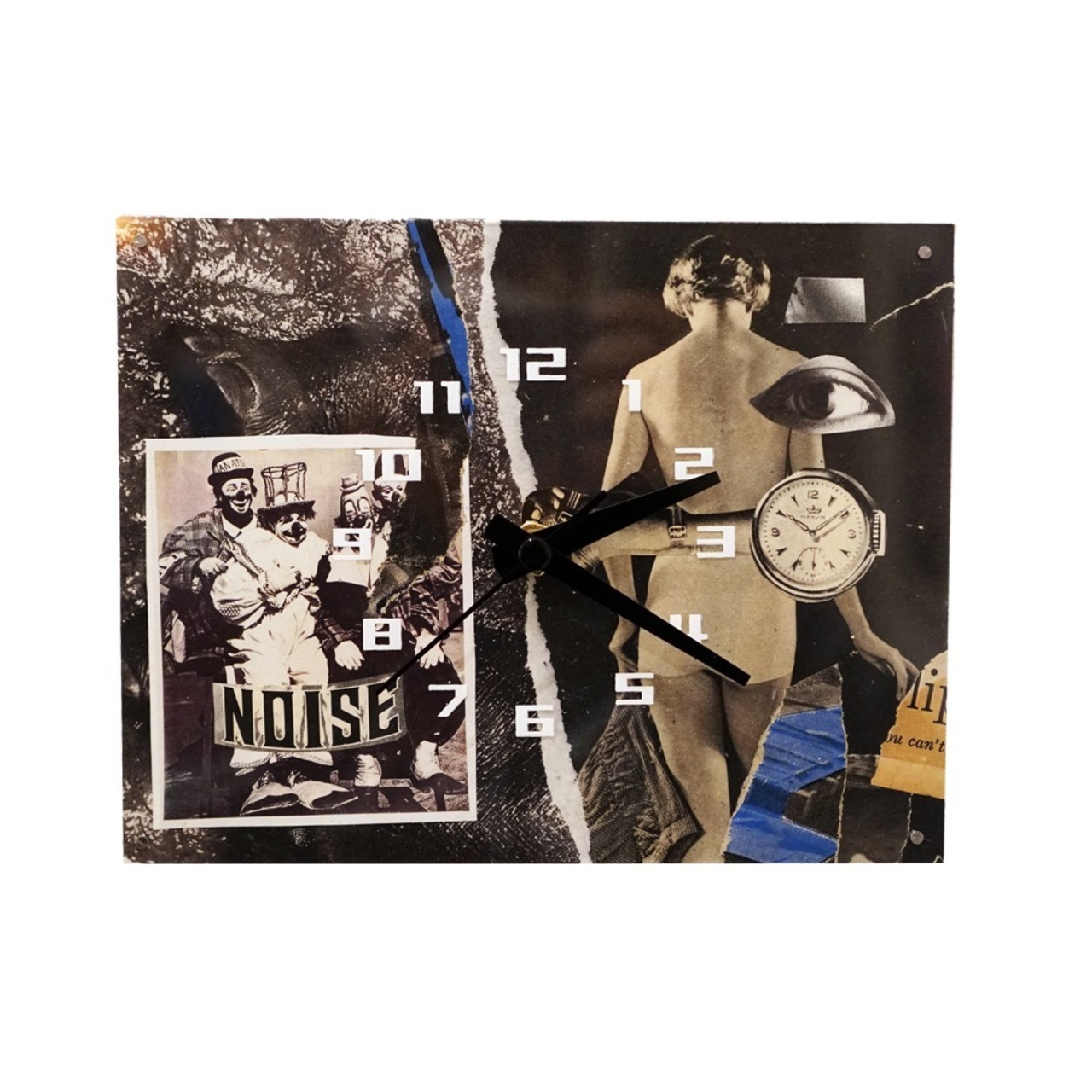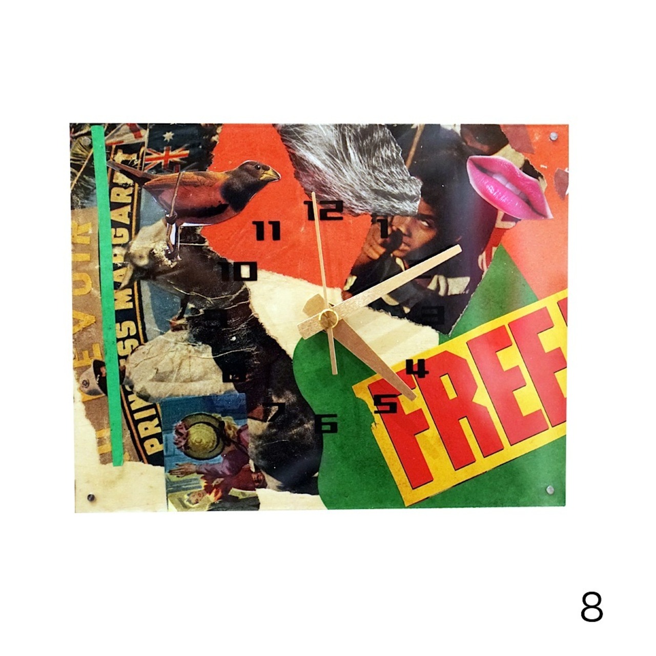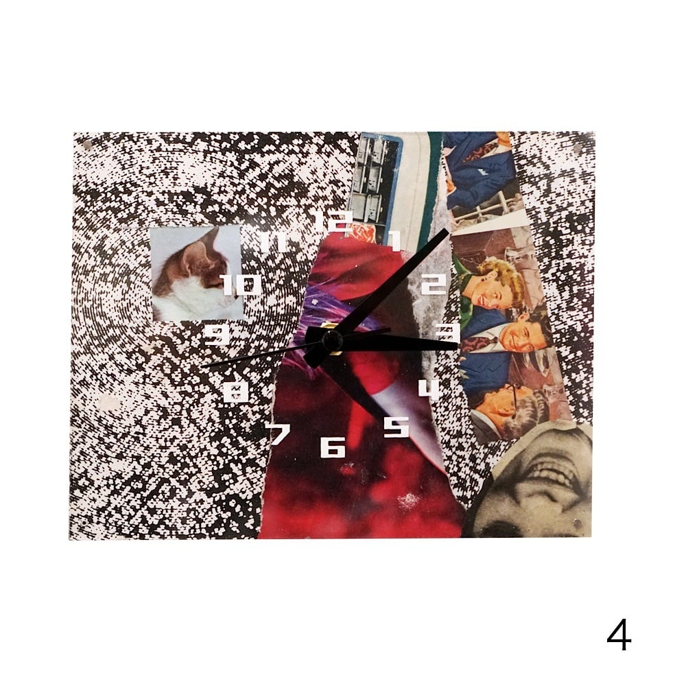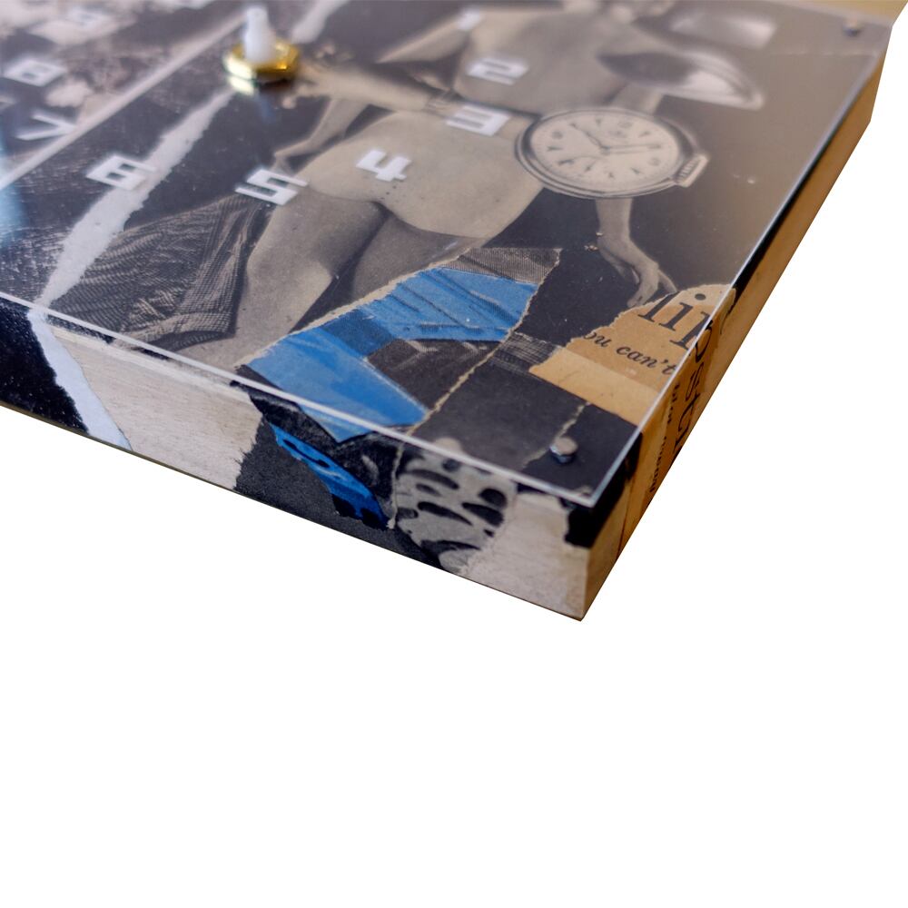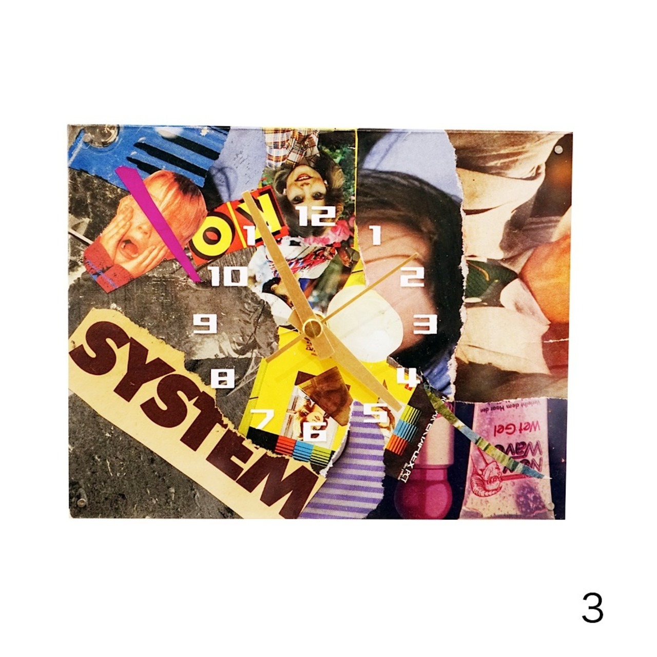 アクリル板にMANUALが時計の文字盤をシルクスクリーンして、キャンバスにonnacodomoがコラージュした上に取り付けた時計です。