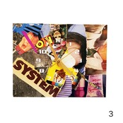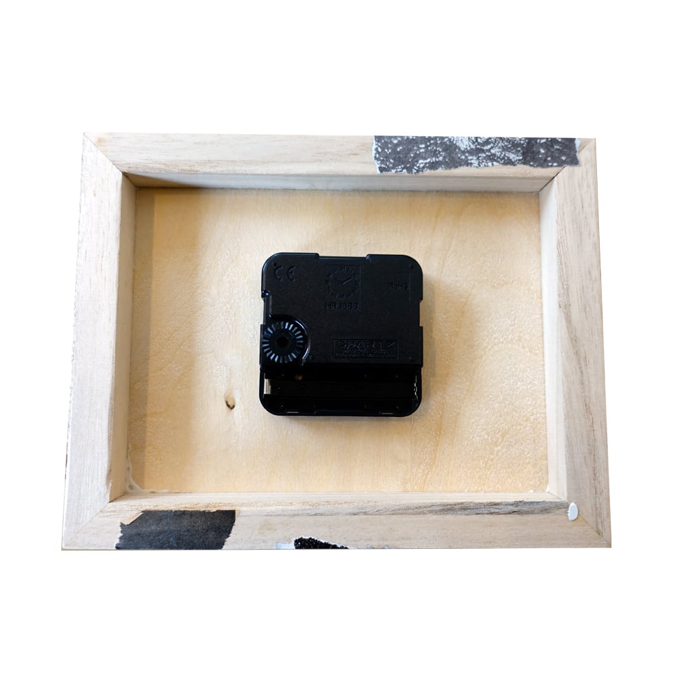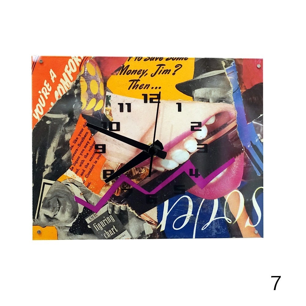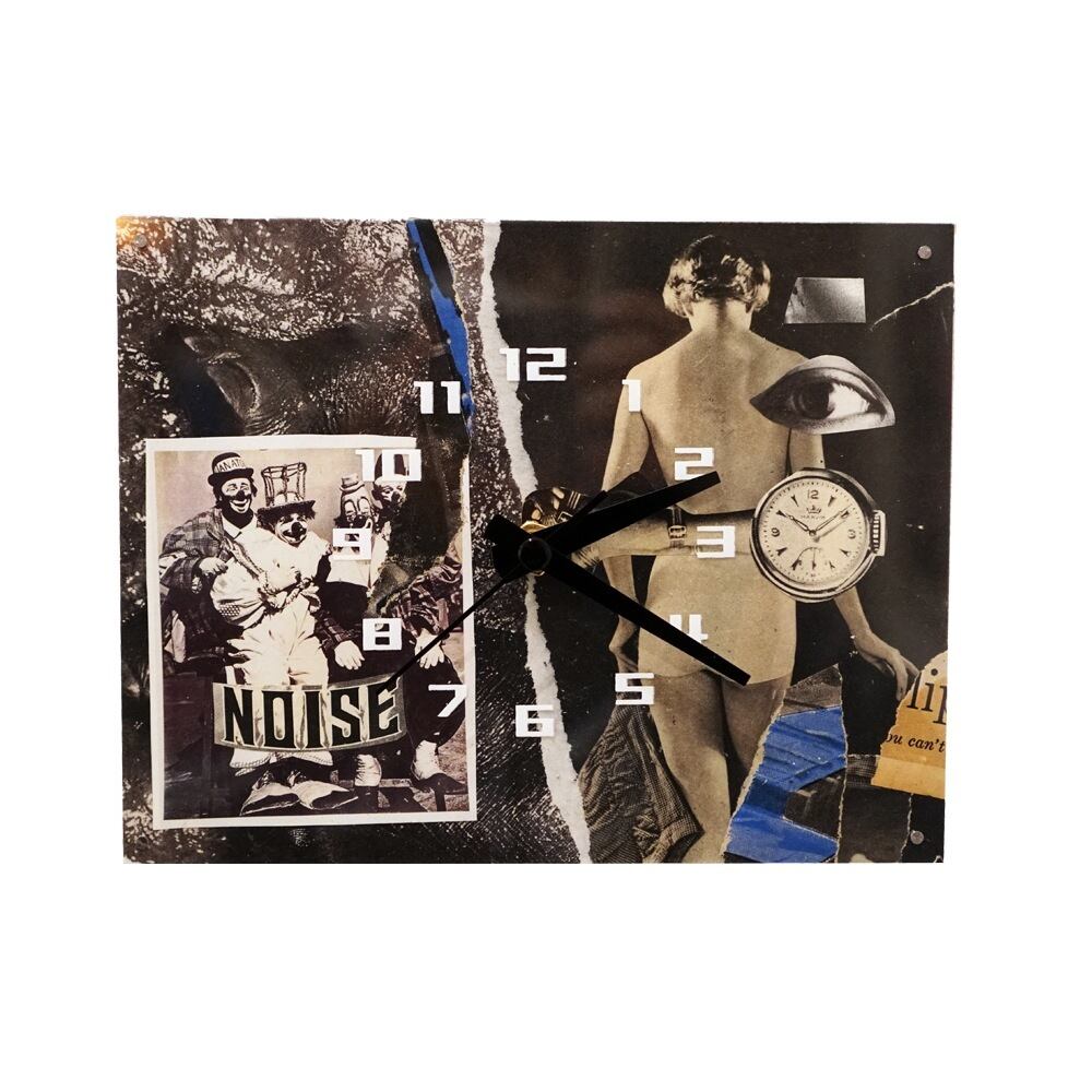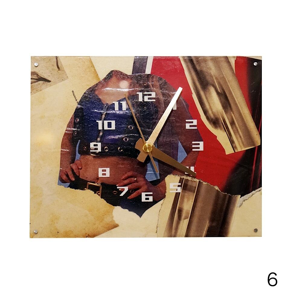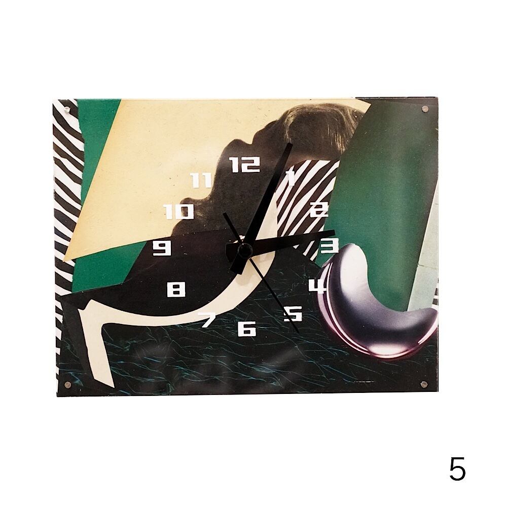 アクリル板にMANUALが時計の文字盤をシルクスクリーンして、キャンバスにonnacodomoがコラージュした上に取り付けた時計です。