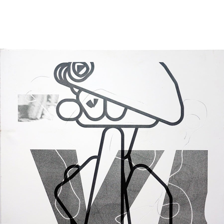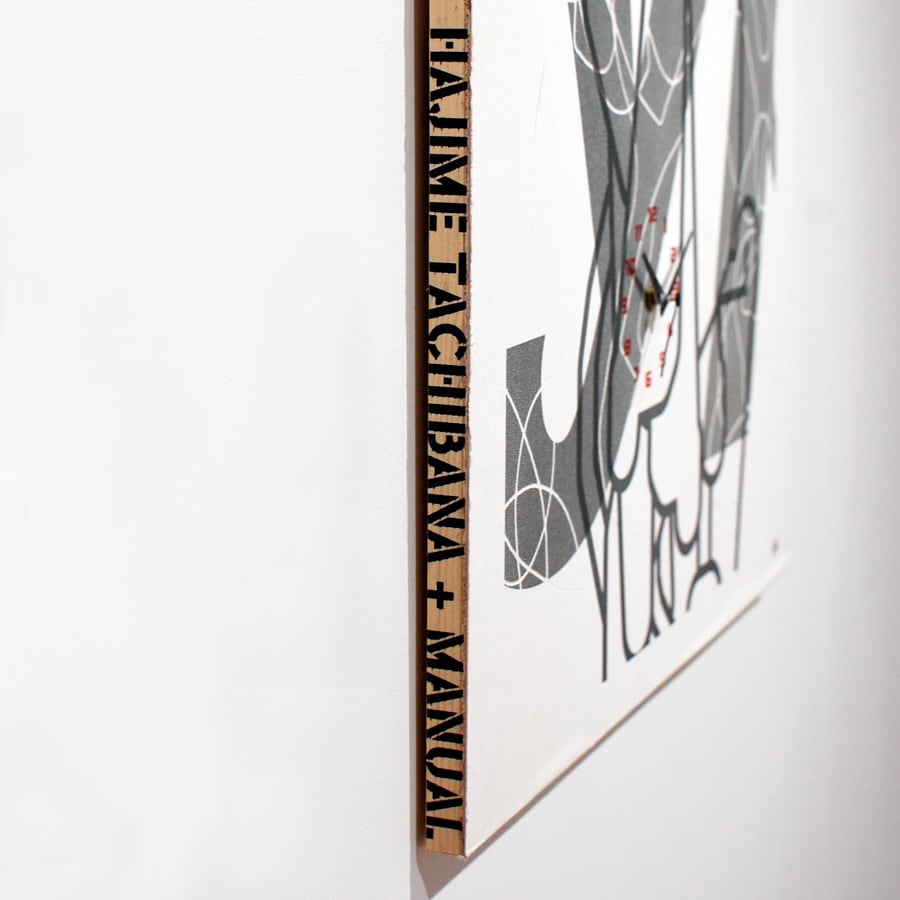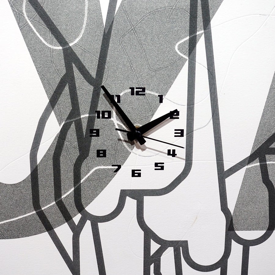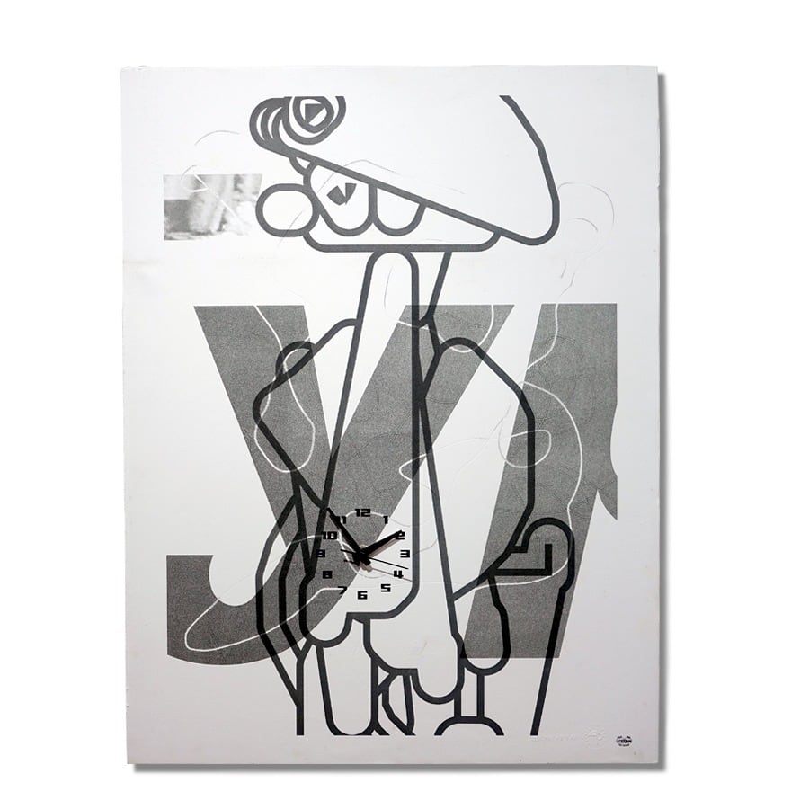 リトグラフポスターに時計のグラフィックをシルクプリントした作品。ちゃんと時計として機能します。